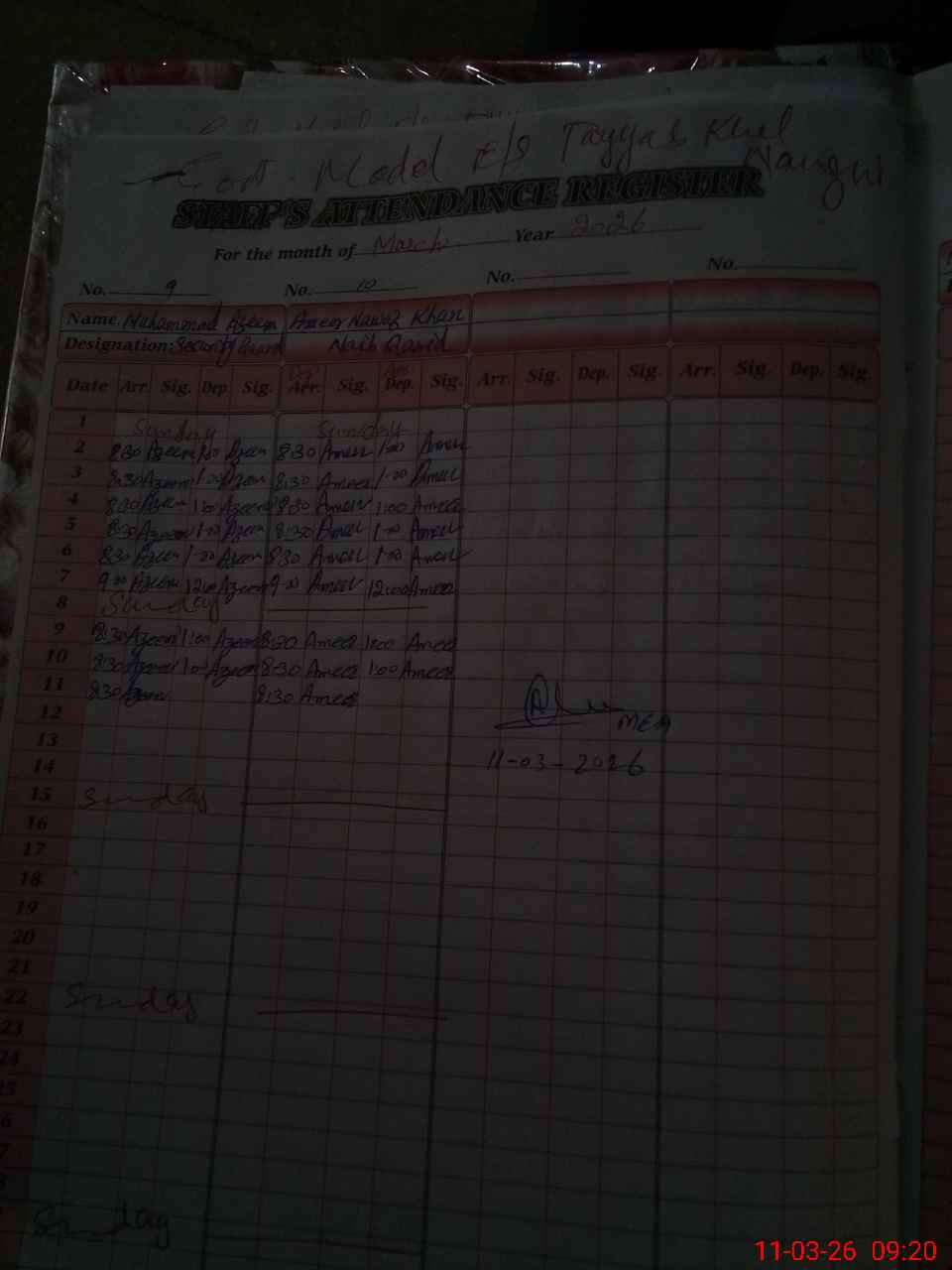 | Monitoring Date: 11-03-2026 | Start Time: 11-03-2026 09:00 AM | End Time: 11-03-2026 09:58 AM | Name of MEA: Ab**** Hu**** | |