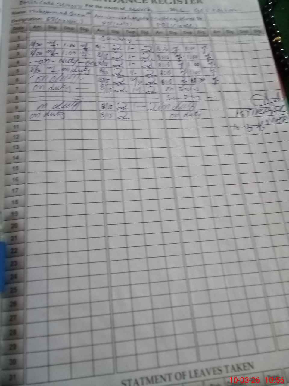 | 36**** | Ab**** Hu**** | EST Science | Regular | 0 | 0 | 0 | 0 | 0 | 0 | 0 | 0 | 0 | Exam Duty |
