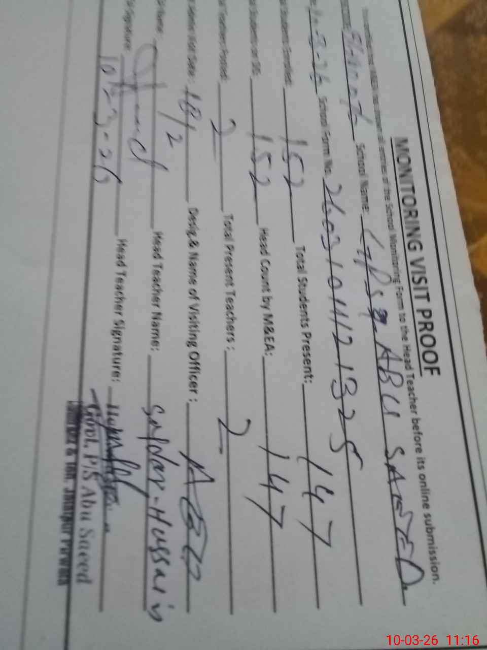 | EMIS Code: 36140076 | Name of School: GPS ABU SAEED P/O BAHADUR PUR ABO SAEED | |||