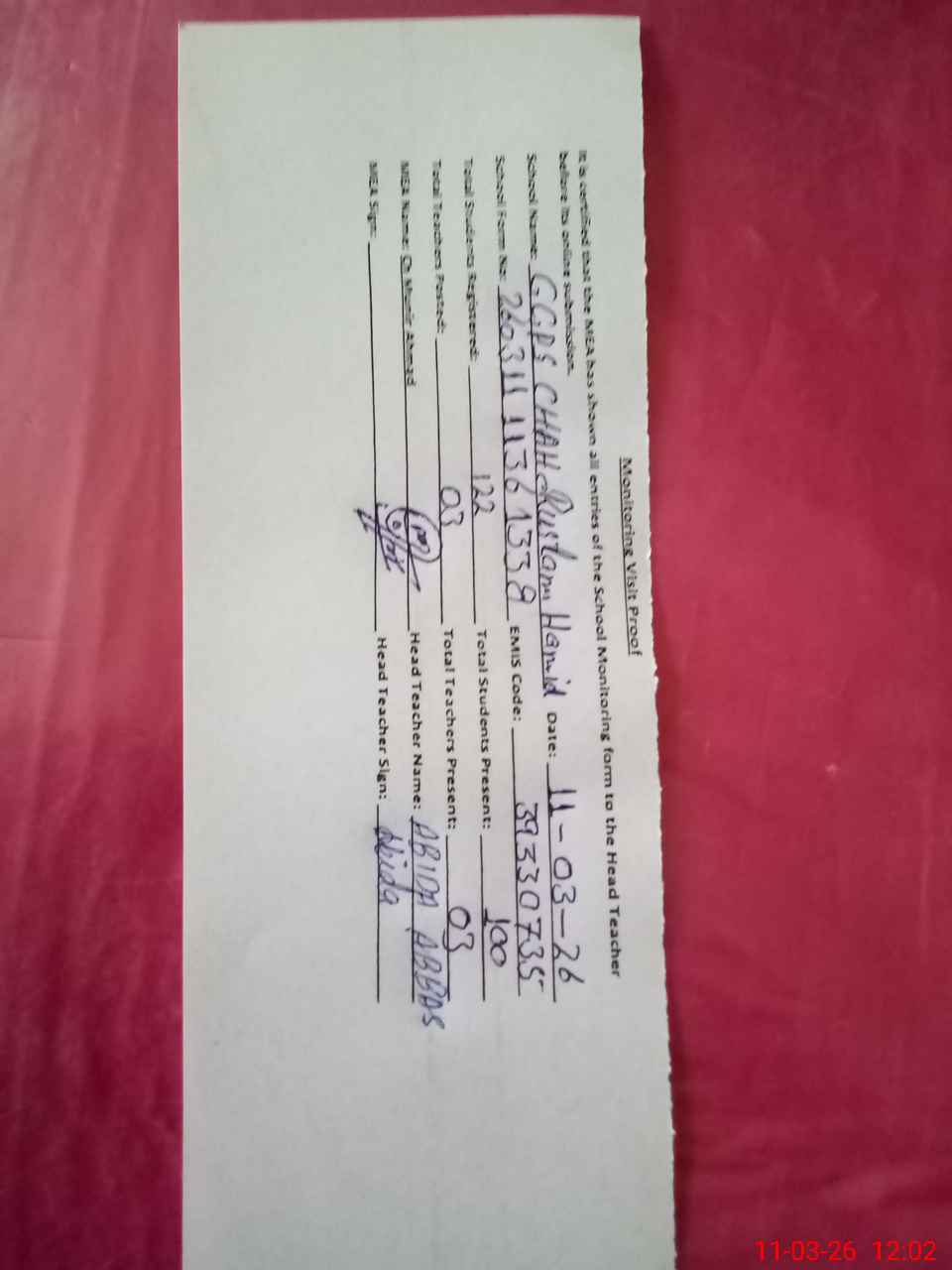 | Attendance Register | Head Teacher | MEA with School | Visit Proof |
