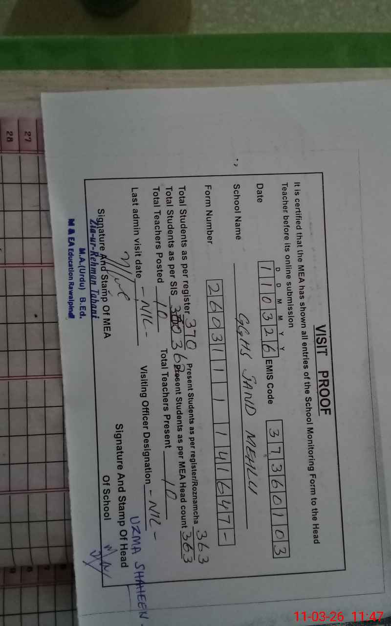 | Attendance Register | Head Teacher | MEA with School | Visit Proof |