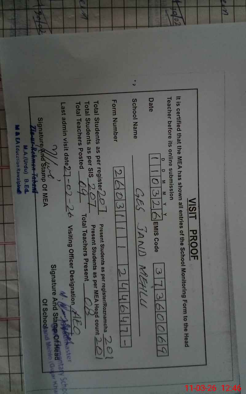 | EMIS Code: 37360069 | Name of School: GES JHAND MEHLO | |||