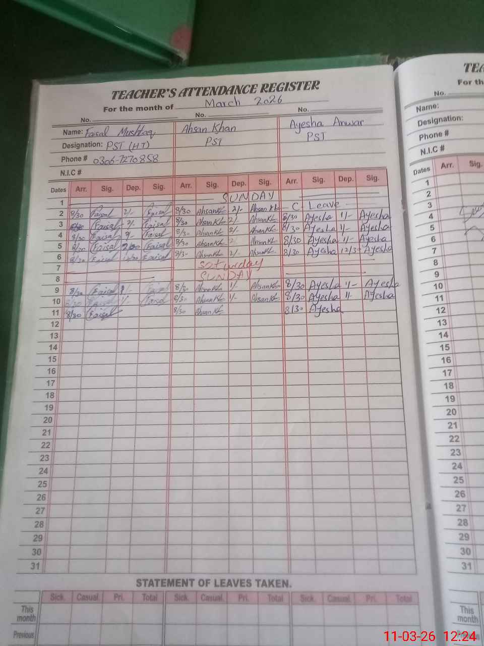 | Leave | Duty | Absent | Maternity | Medical | Ex- Pak |