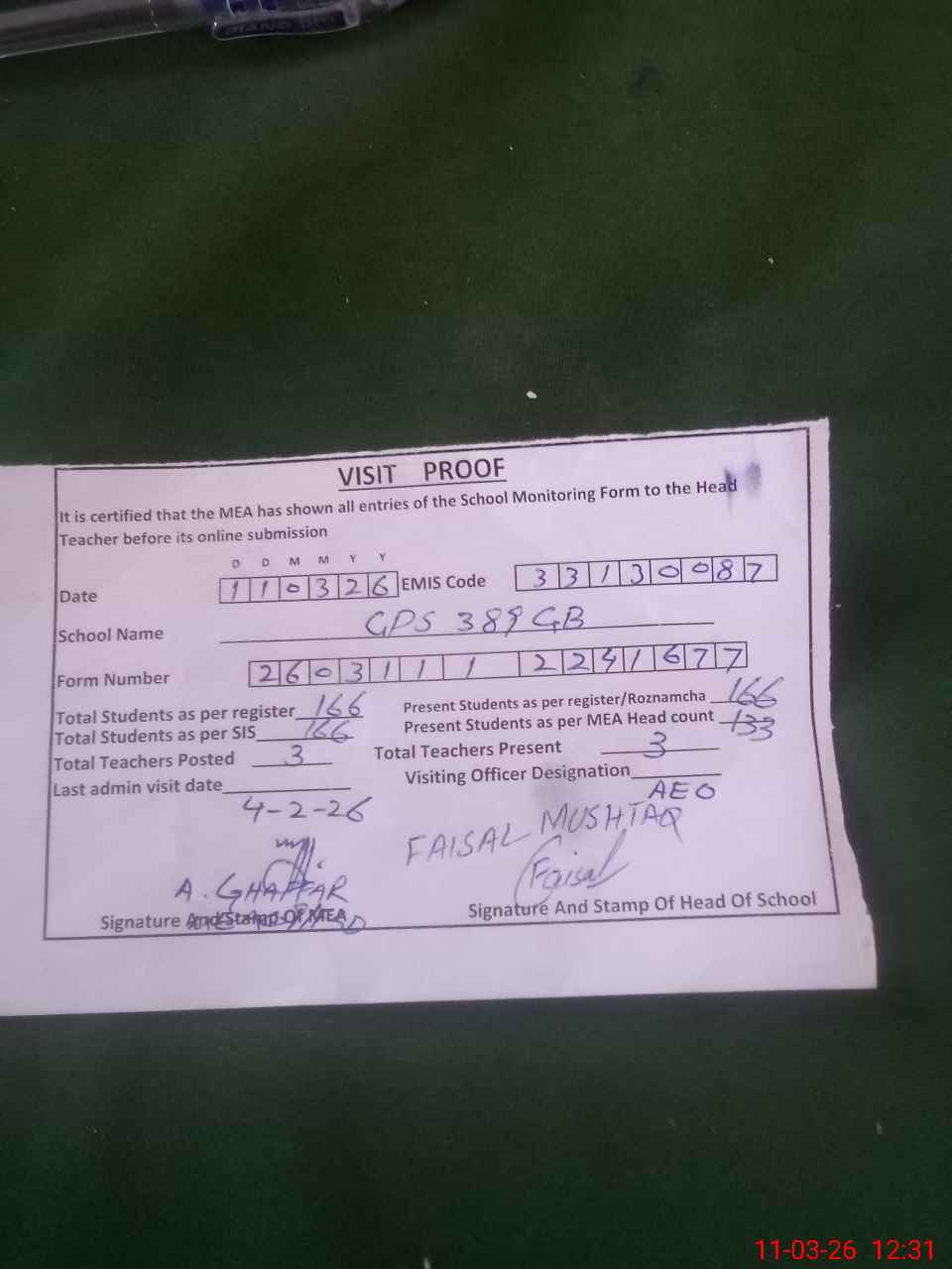 | Attendance Register | Head Teacher | MEA with School | Visit Proof |
