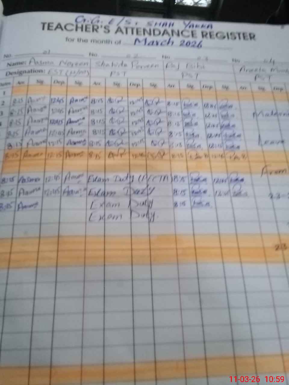 | 35**** | Sh**** Pa**** | PST Arts | Regular | 0 | 0 | 0 | 0 | 0 | 0 | 0 | 0 | 0 | Exam Duty |