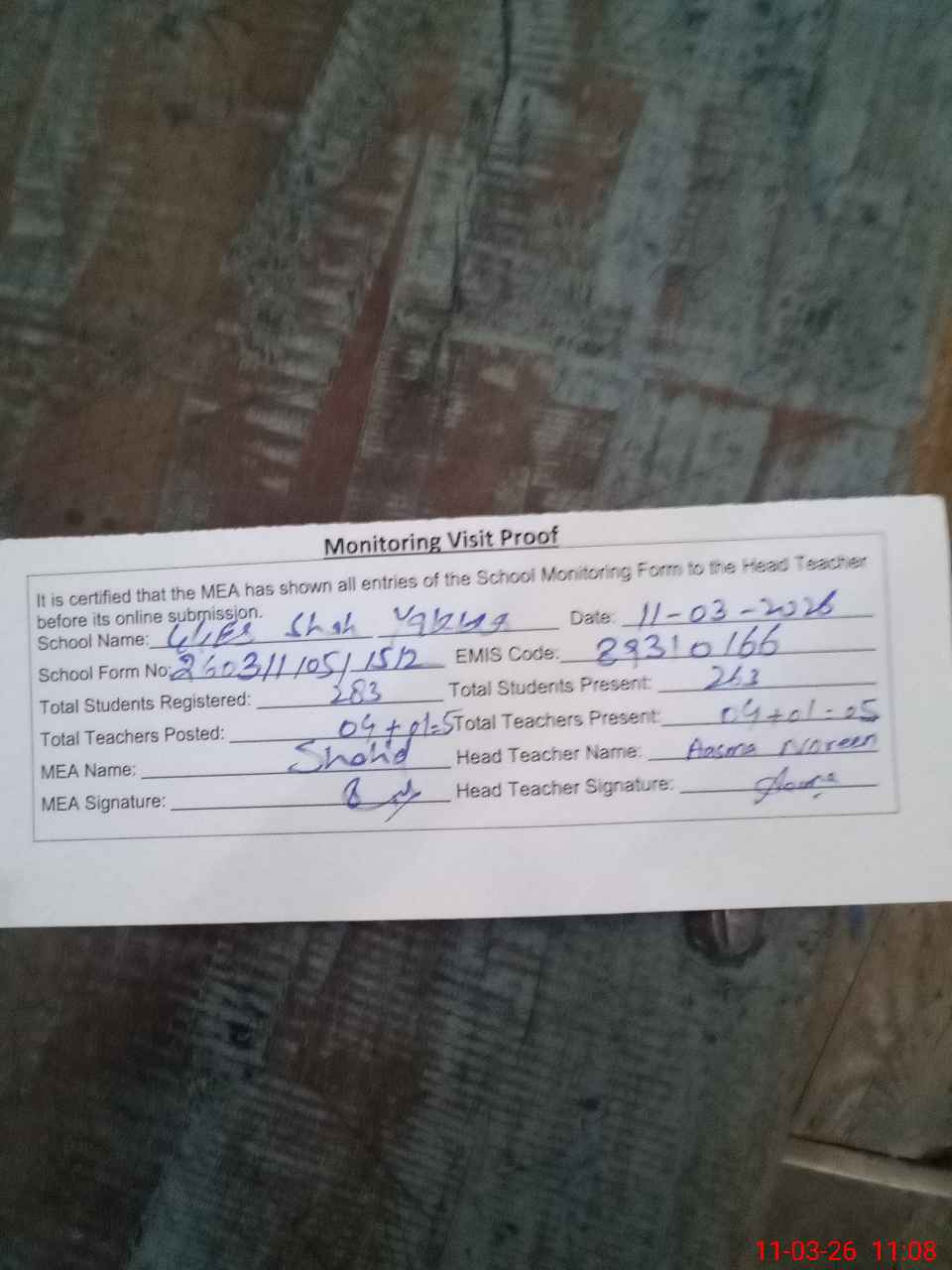 | Attendance Register | Head Teacher | MEA with School | Visit Proof |