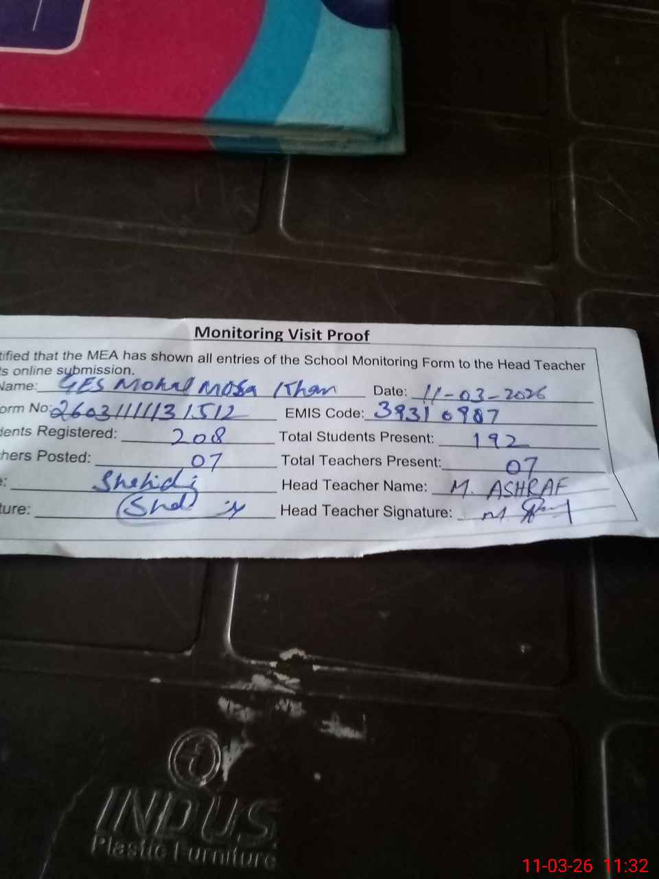 | Attendance Register | Head Teacher | MEA with School | Visit Proof |
