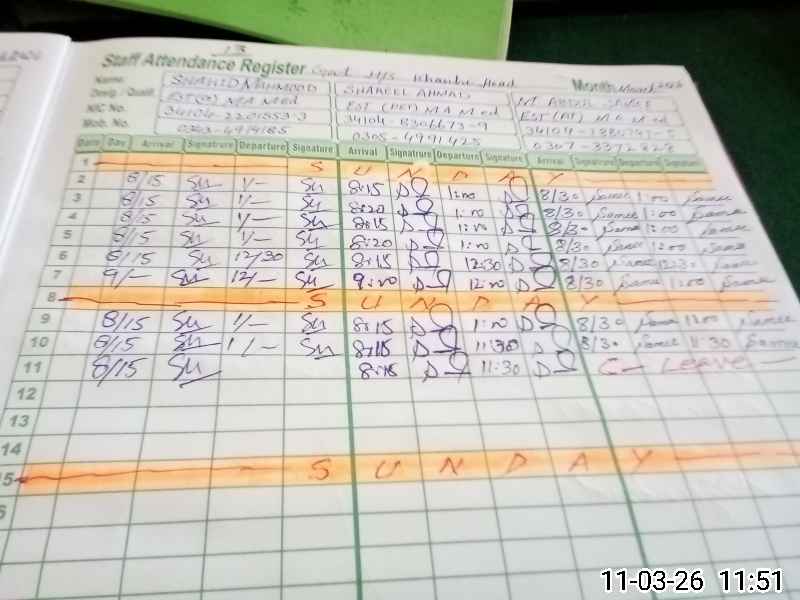 | CNIC | Full Name | Designation | R/C | Absence During Last Calender Month |
