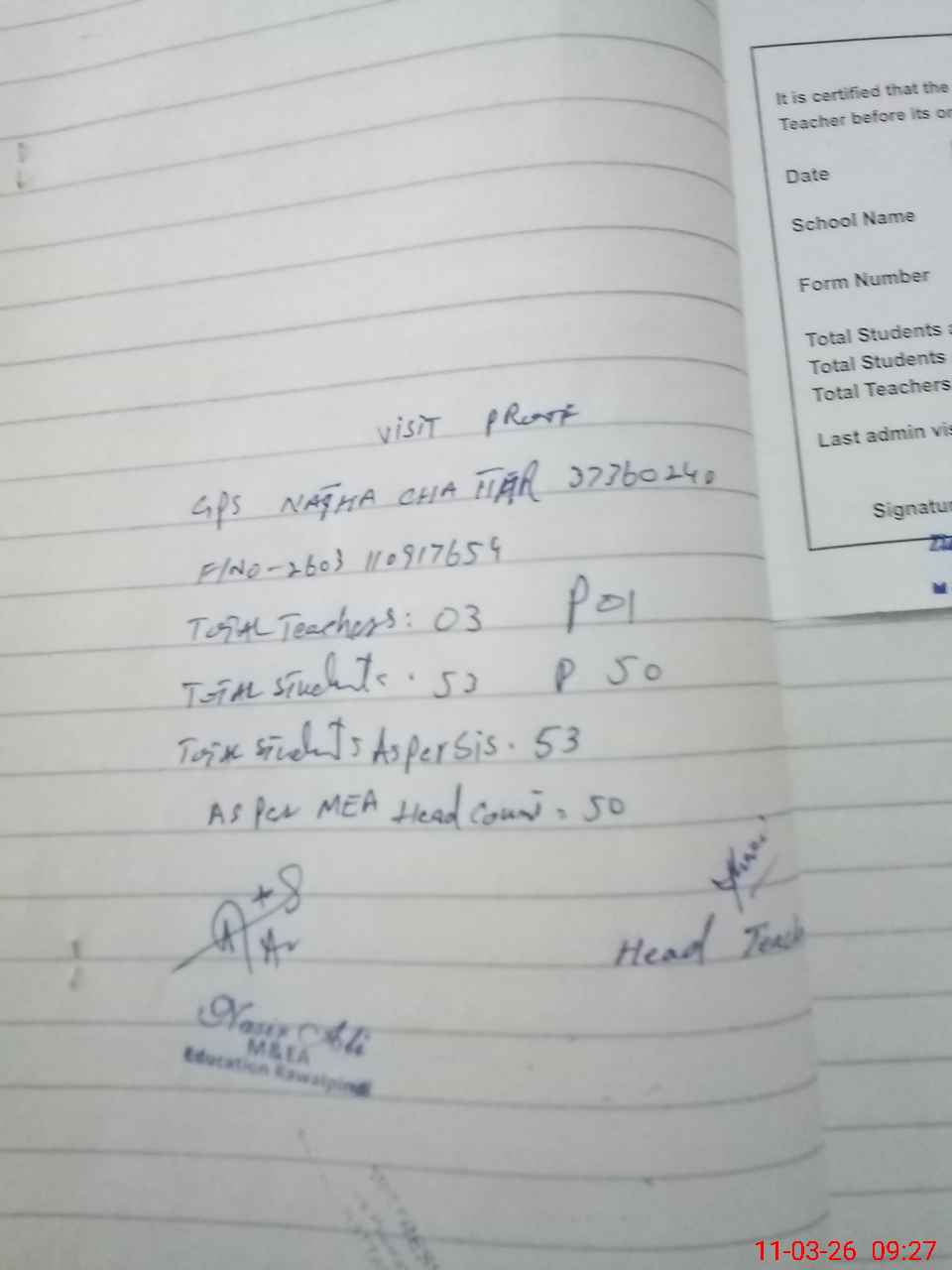 | Attendance Register | Head Teacher | MEA with School | Visit Proof |