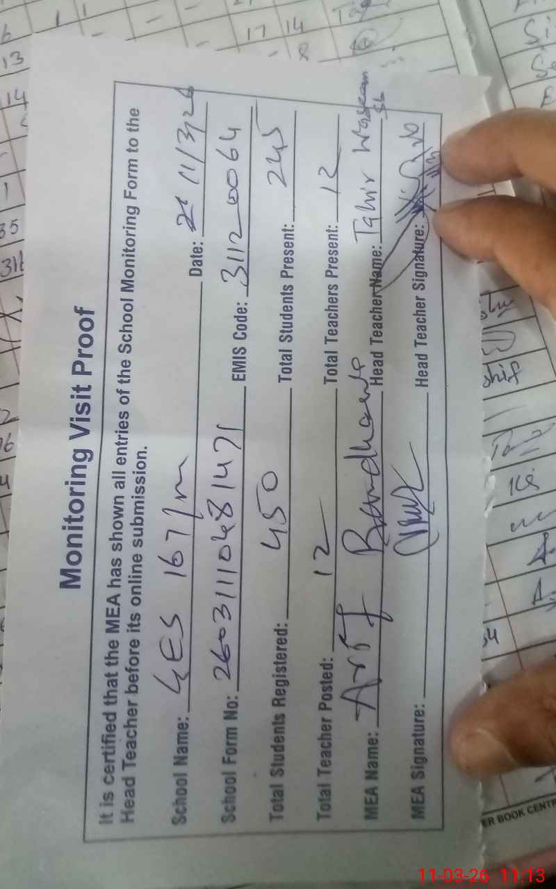 | Attendance Register | Head Teacher | MEA with School | Visit Proof |