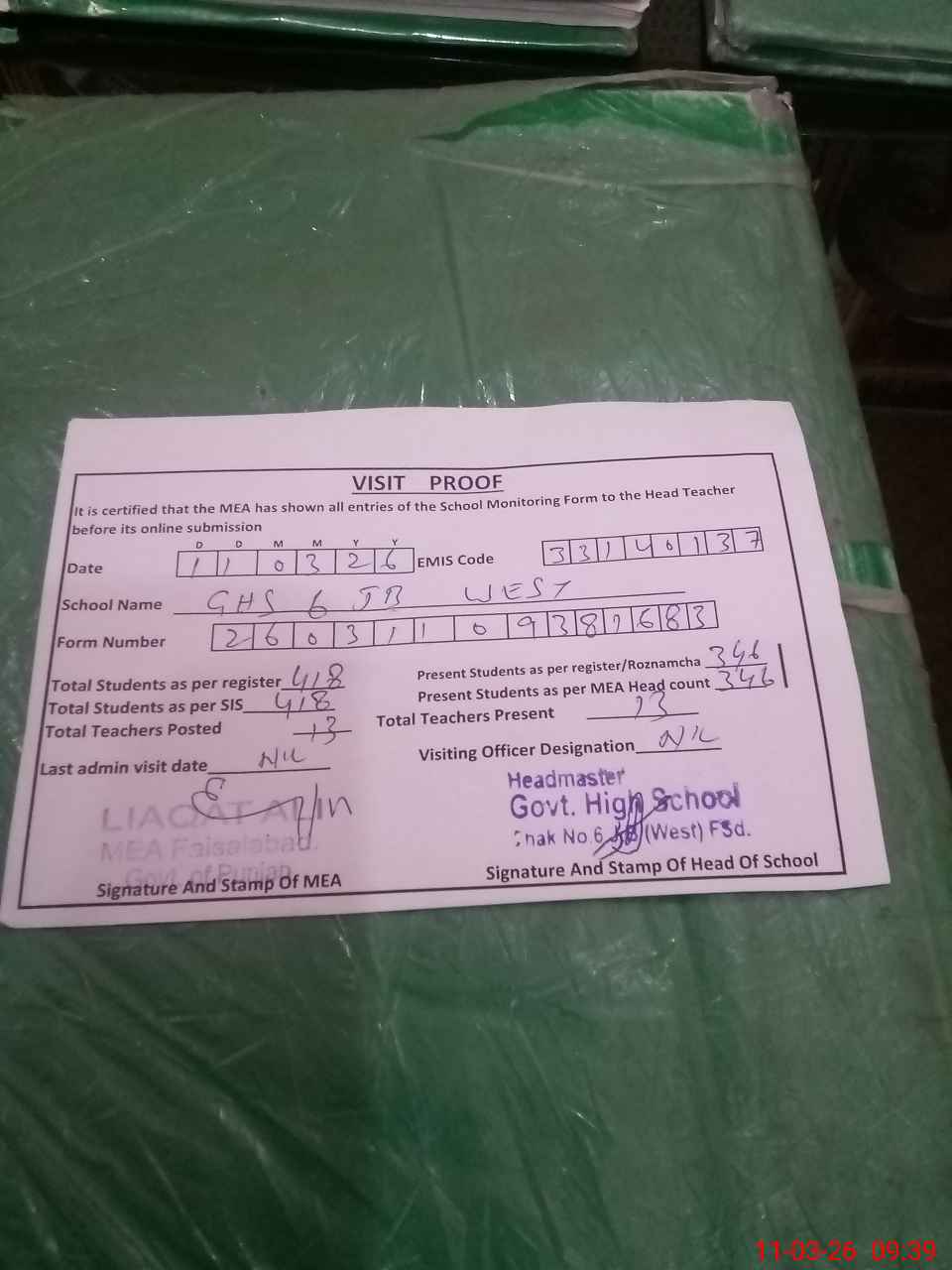 | Attendance Register | Head Teacher | MEA with School | Visit Proof |