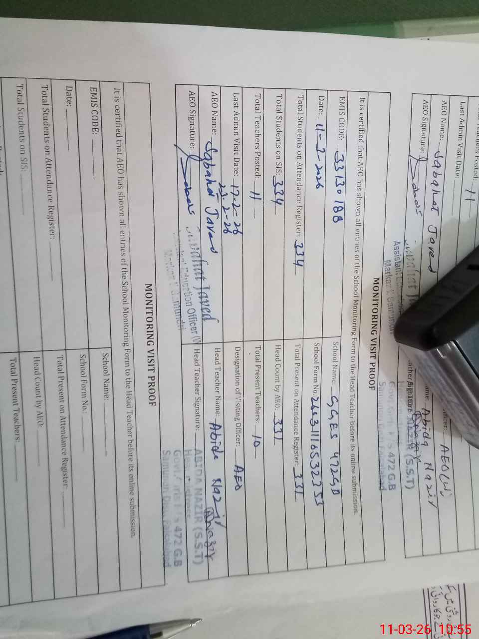 | Certified that this School was Inspected by the Undersigned MEA/DMO Today and the Information Stated Above is as Per Record. | |||||