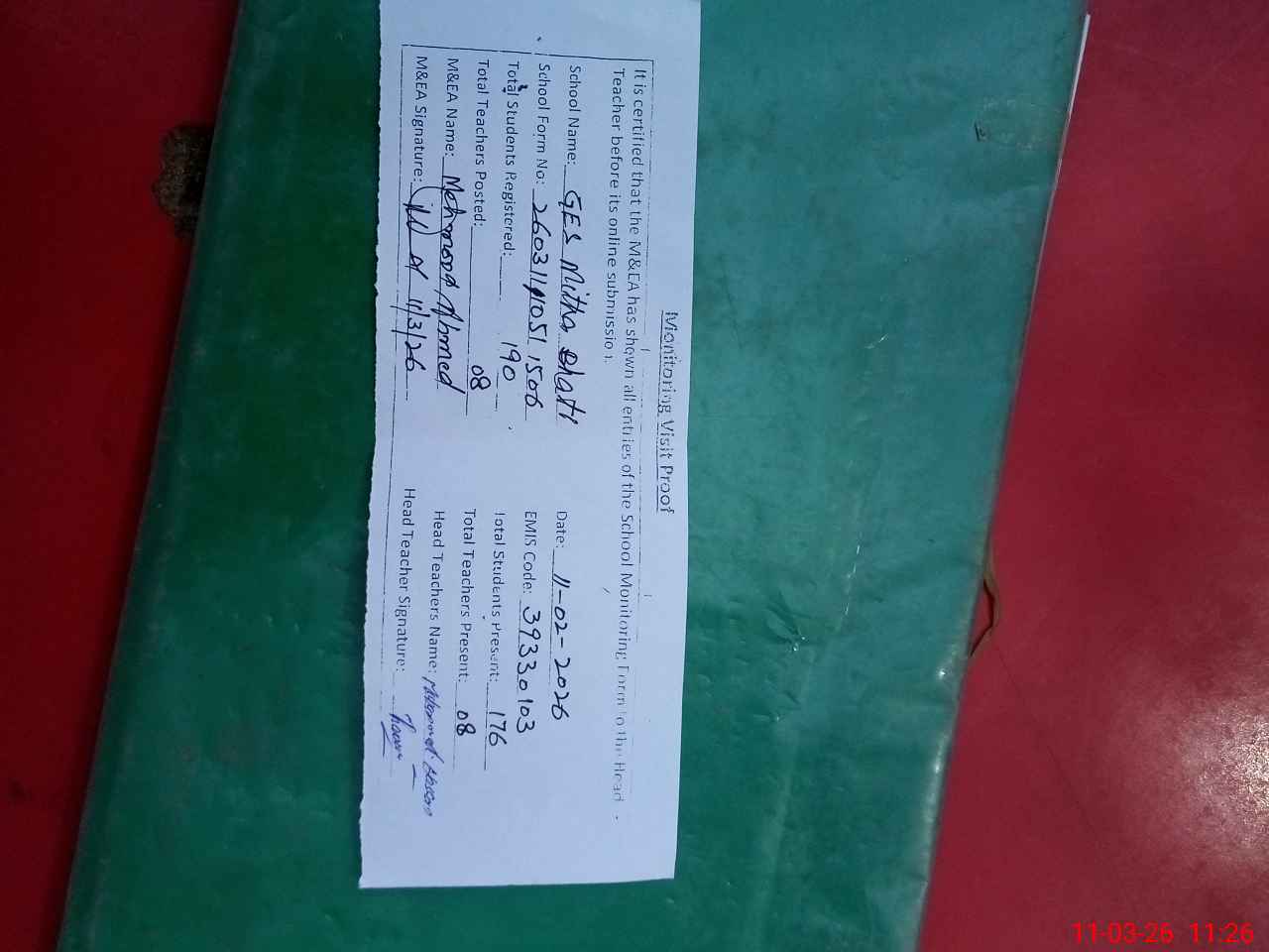 | Attendance Register | Head Teacher | MEA with School | Visit Proof |