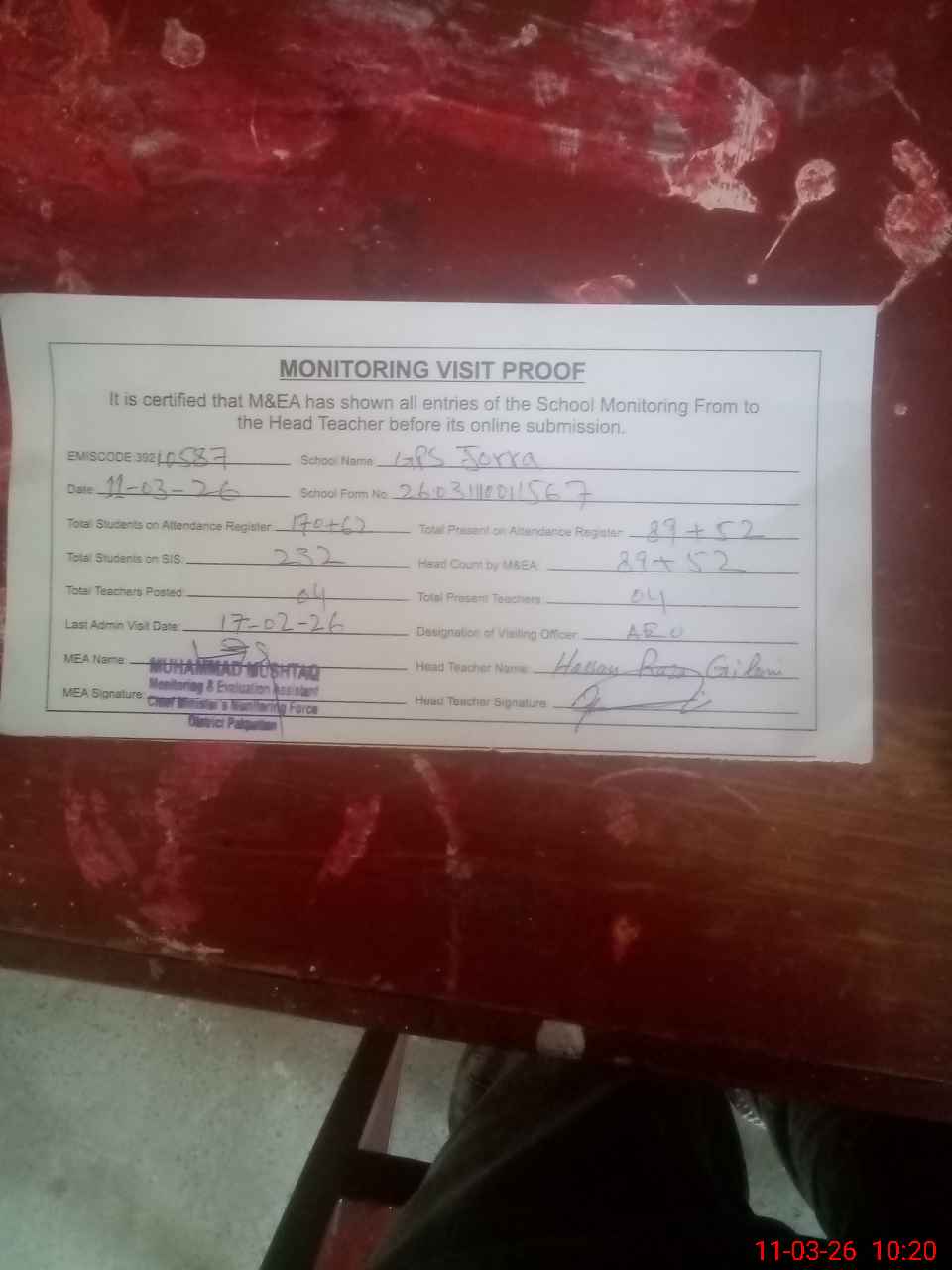 | Attendance Register | Head Teacher | MEA with School | Visit Proof |