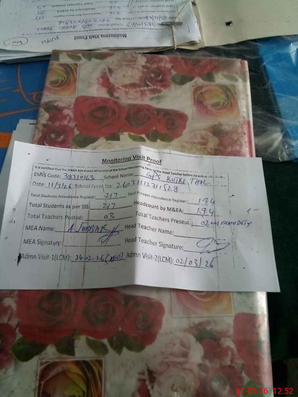 | Attendance Register | Head Teacher | MEA with School | Visit Proof |