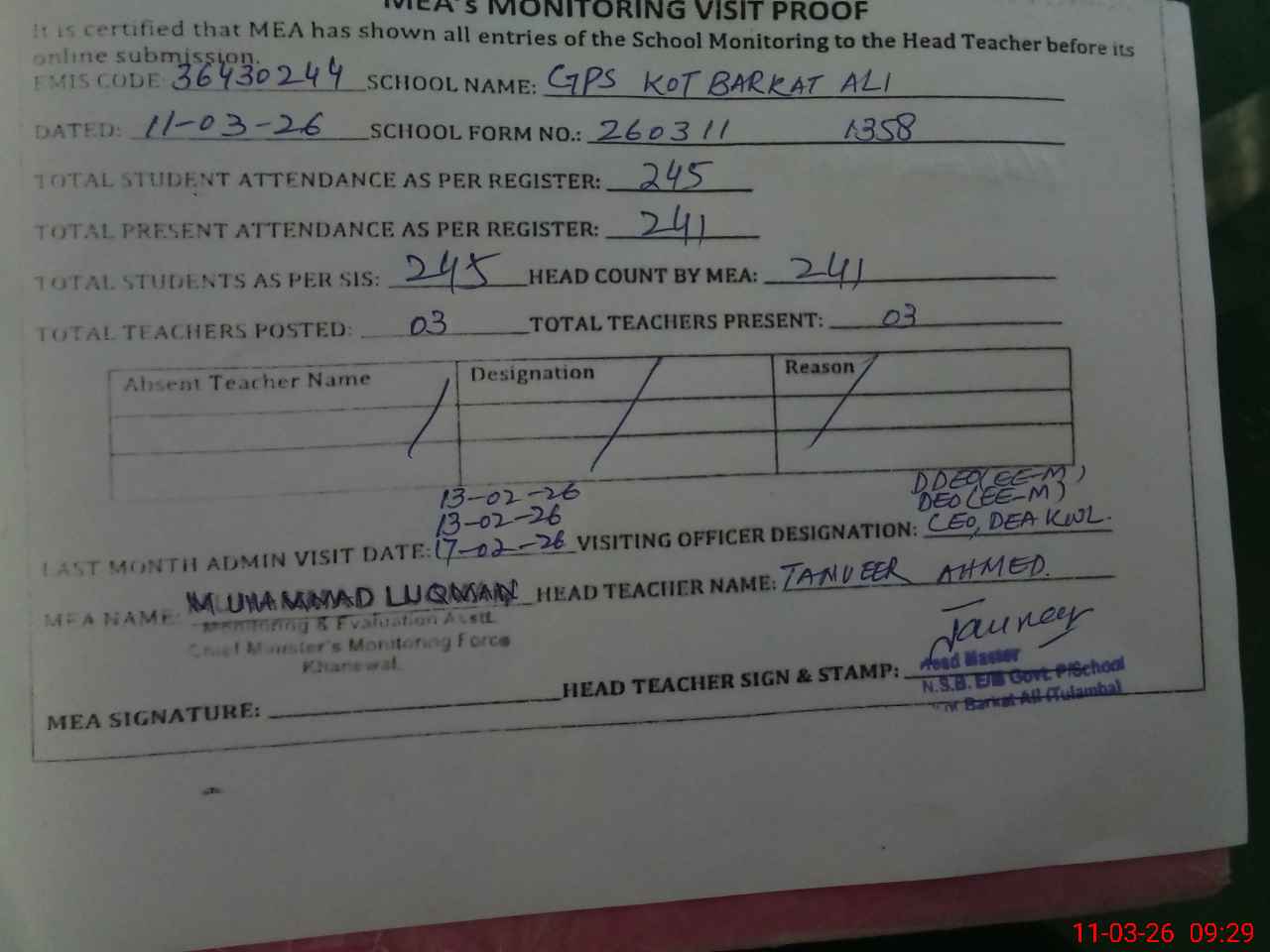 | EMIS Code: 36430244 | Name of School: GPS KOT BARKAT ALI, TULAMBA | |||