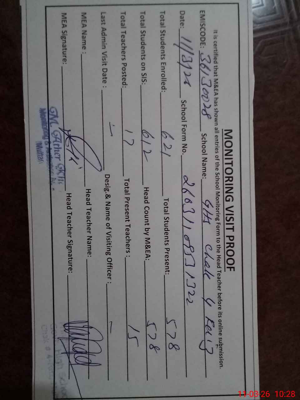 | EMIS Code: 36130028 | Name of School: GHS CHAK 4 FAIZ MULTAN | |||