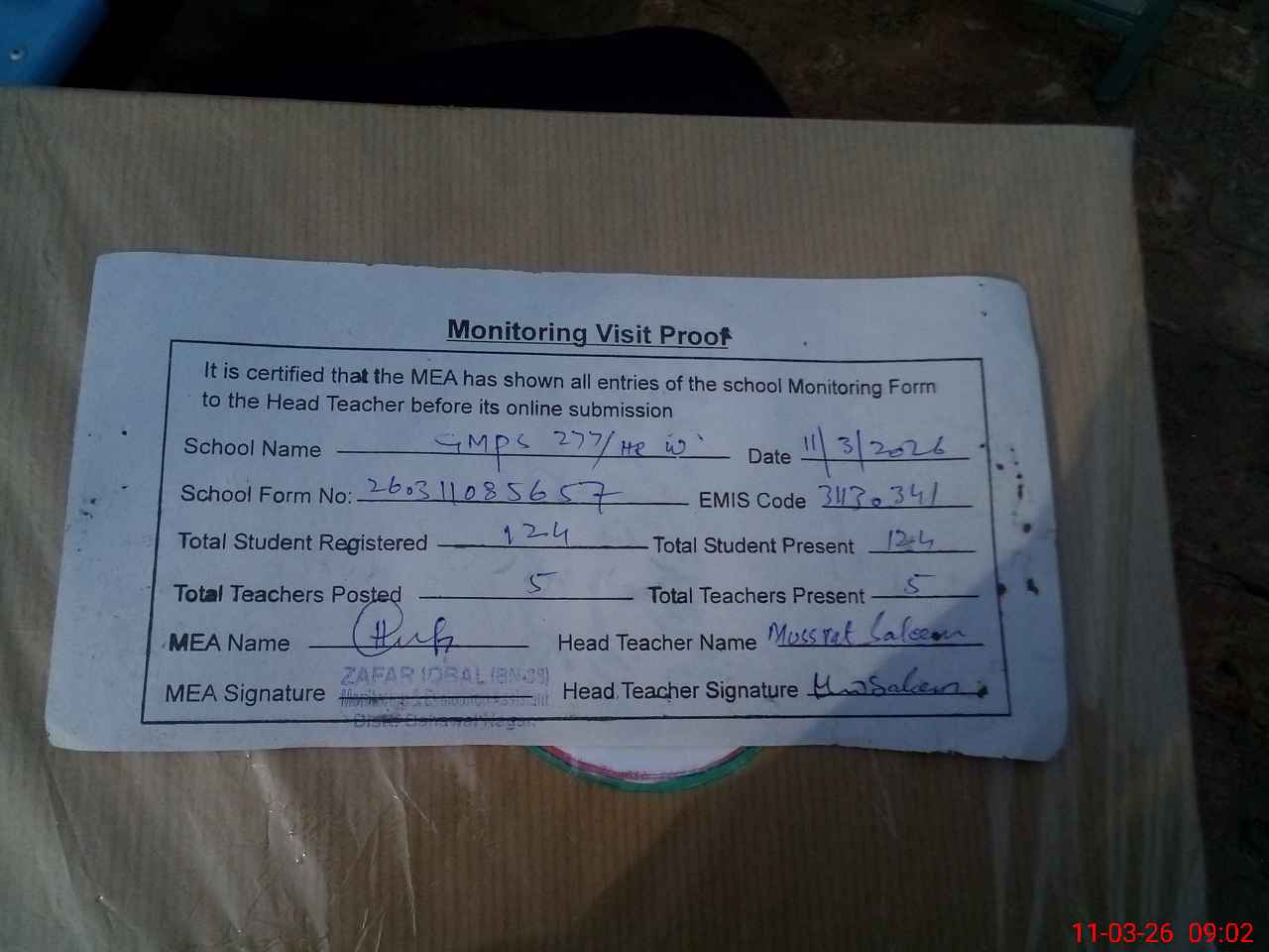 | Attendance Register | Head Teacher | MEA with School | Visit Proof |