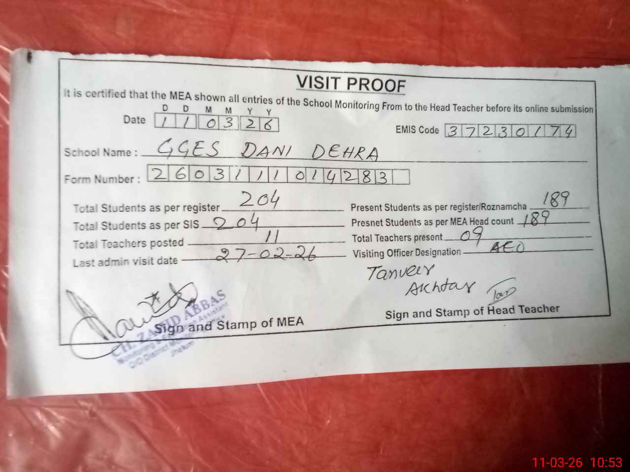 | Attendance Register | Head Teacher | MEA with School | Visit Proof |