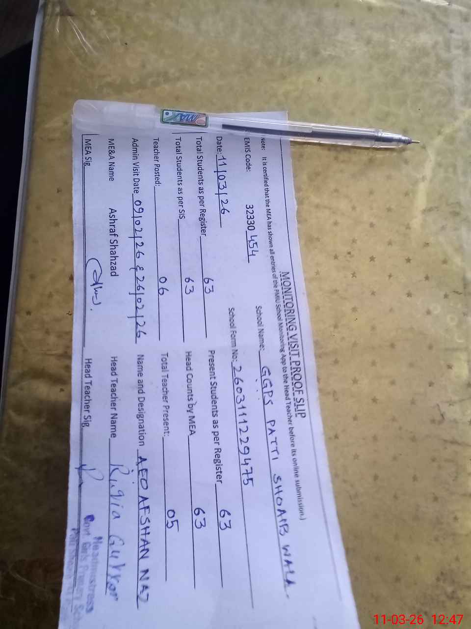 | Attendance Register | Head Teacher | MEA with School | Visit Proof |