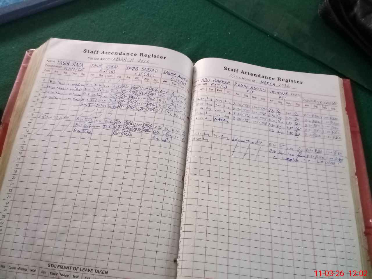 | Remarks (Use Separate Page if Required): Shehryar Khan c leave fwd and waiting for approval 2 teachers went to examination centre along with 8th class students | |||||