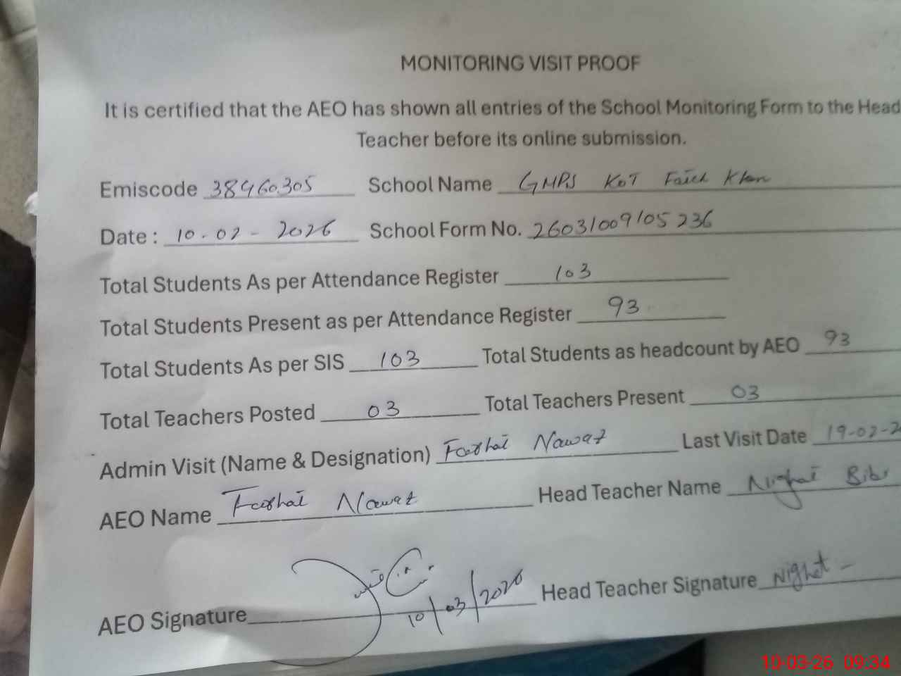 | Monitoring Date: 10-03-2026 | Start Time: 10-03-2026 09:01 AM | End Time: 10-03-2026 09:34 AM | Name of MEA: FA**** NA**** | |
