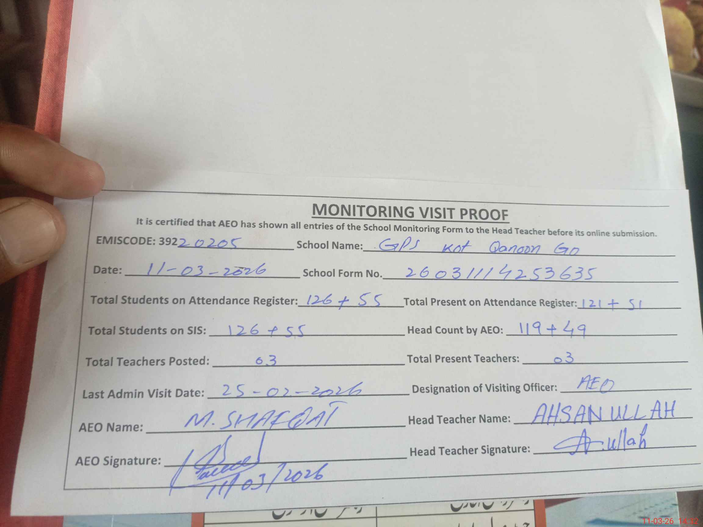 | Attendance Register | Head Teacher | MEA with School | Visit Proof |