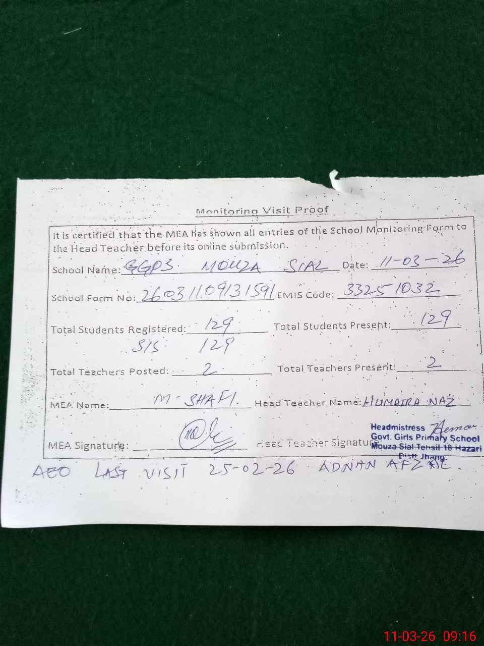 | EMIS Code: 33251032 | Name of School: GGPS MOUZA SIAL | |||