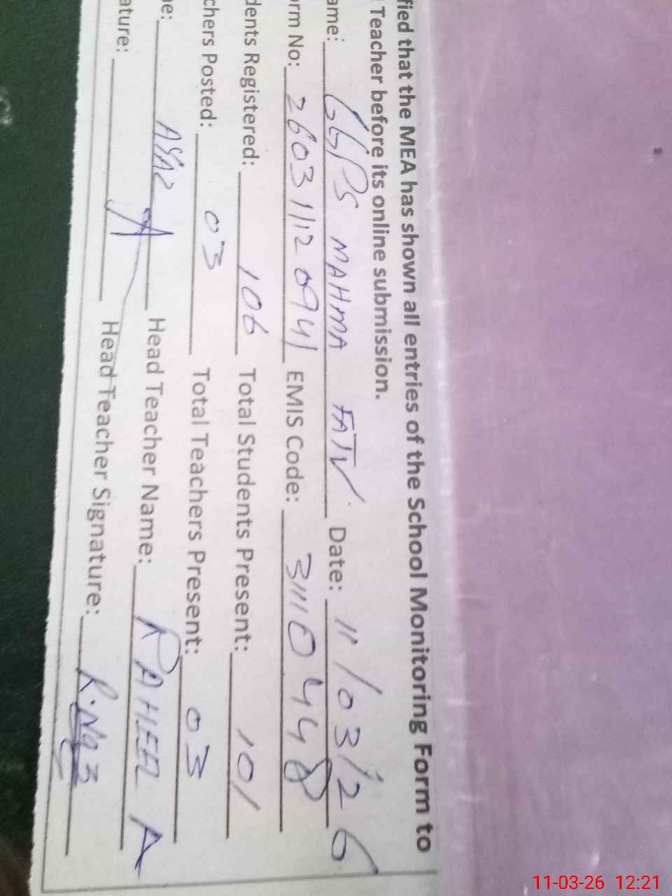 | Name: Ra**** Na**** Designation: (School Headmaster's/Headmistress's) PST Phone/Cell Number: 03**** |