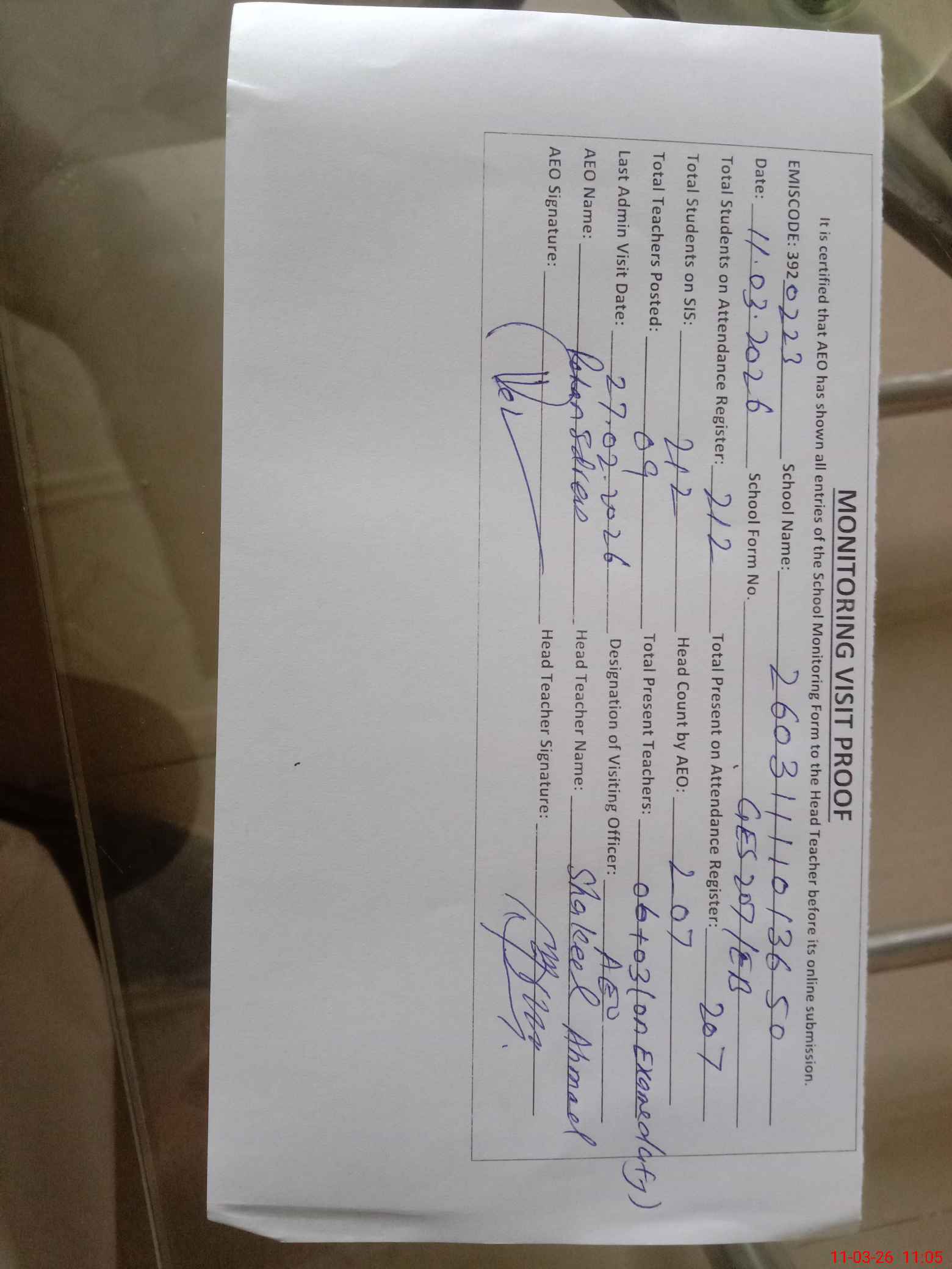 | EMIS Code: 39220223 | Name of School: GES CHAK NO. 207 EB P.O SAME ARIF WALA | |||