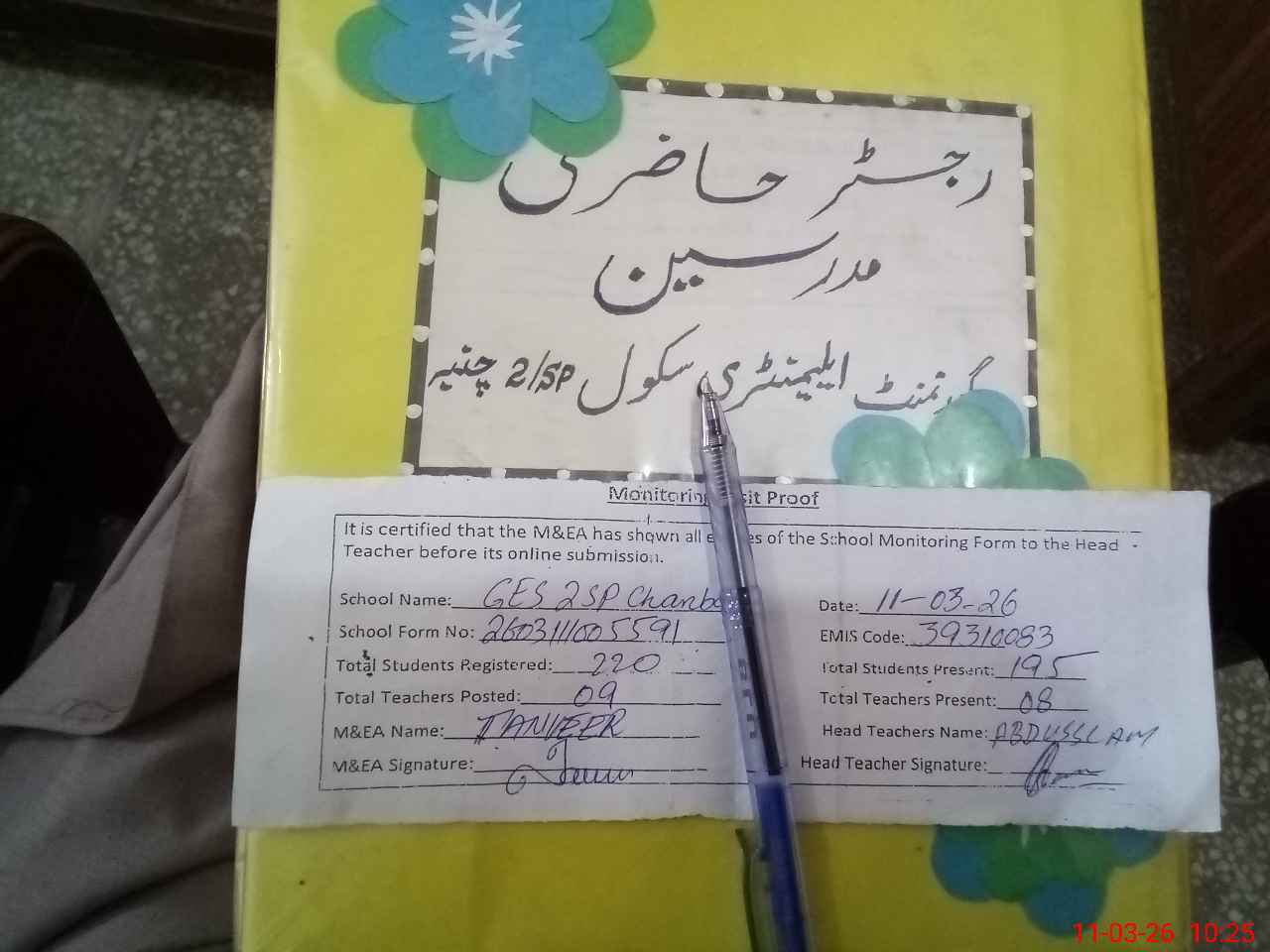 | Attendance Register | Head Teacher | MEA with School | Visit Proof |