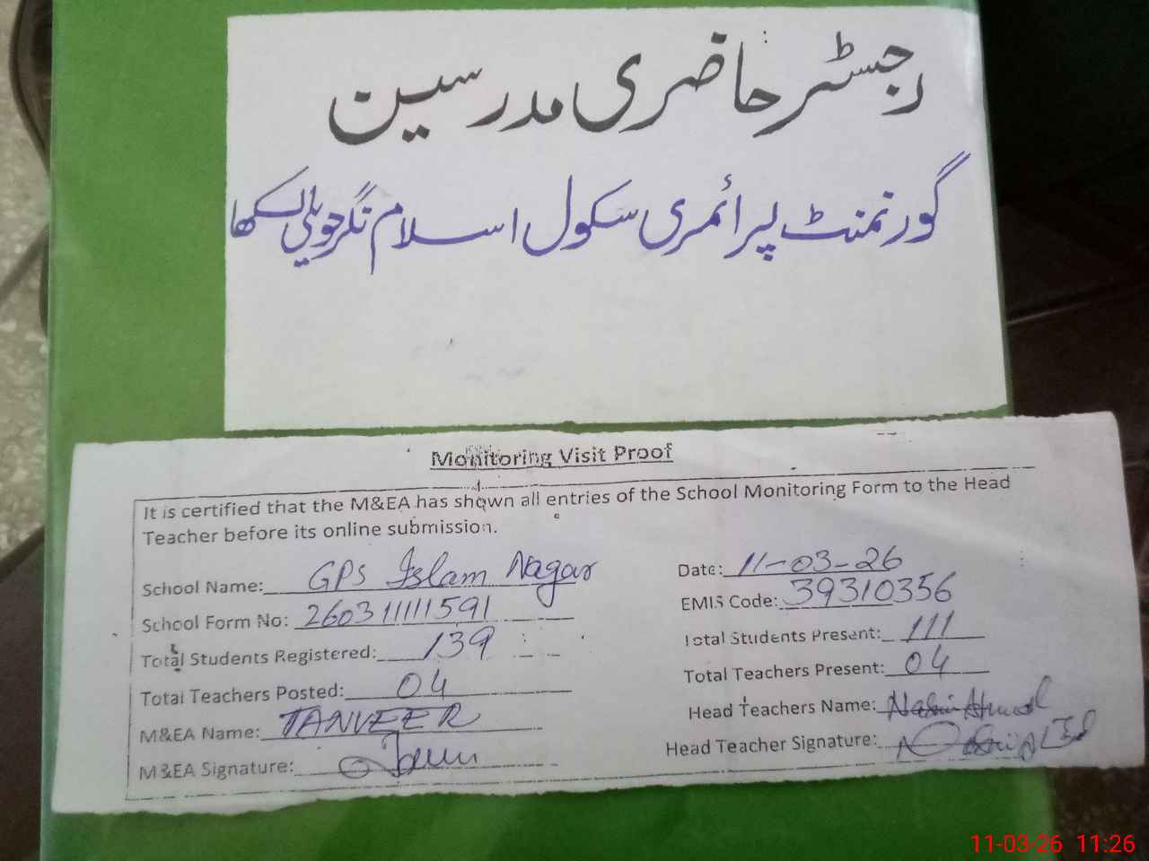 | Attendance Register | Head Teacher | MEA with School | Visit Proof |