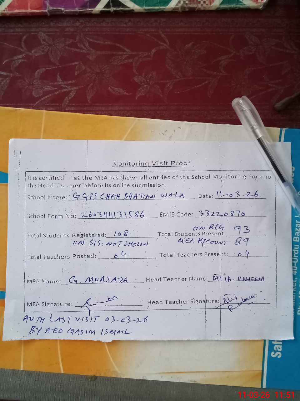 | EMIS Code: 33220870 | Name of School: GGPS CHAH BHATIAN WALA | |||