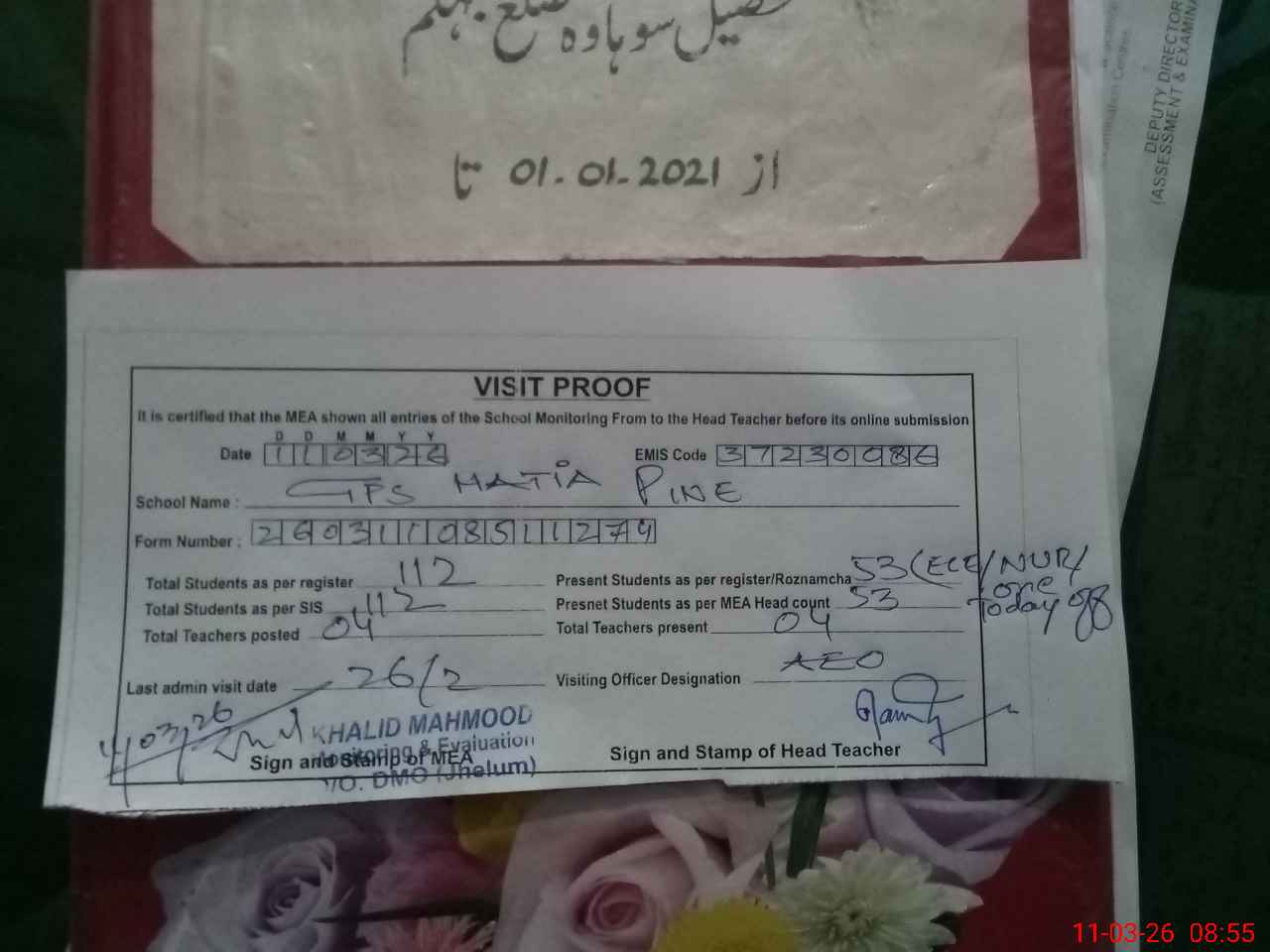 | Certified that this School was Inspected by the Undersigned MEA/DMO Today and the Information Stated Above is as Per Record. | |||||