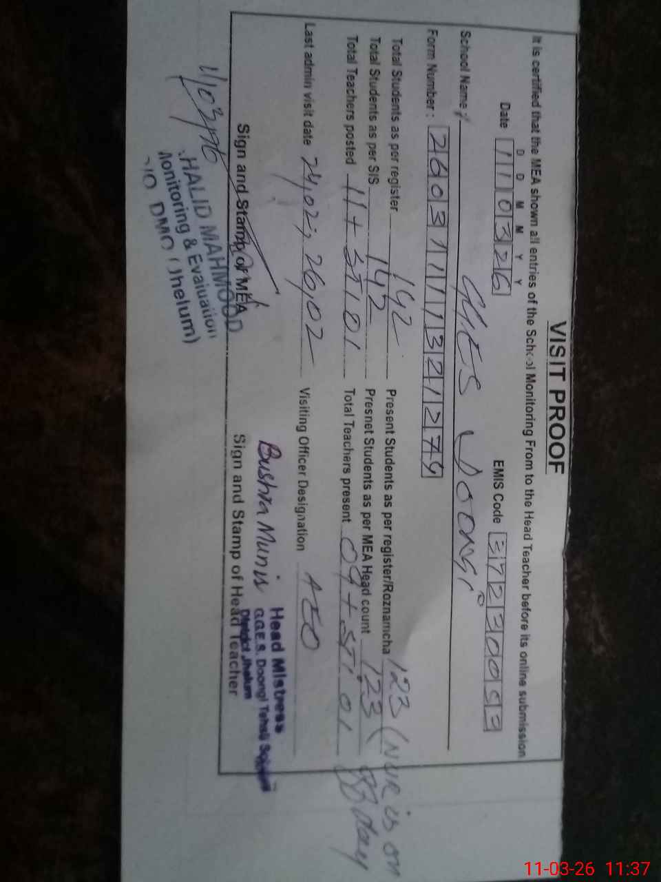 | Certified that this School was Inspected by the Undersigned MEA/DMO Today and the Information Stated Above is as Per Record. | |||||
