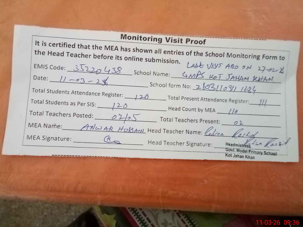 | EMIS Code: 35220438 | Name of School: GMPS KOT JAHAN KHAN | |||