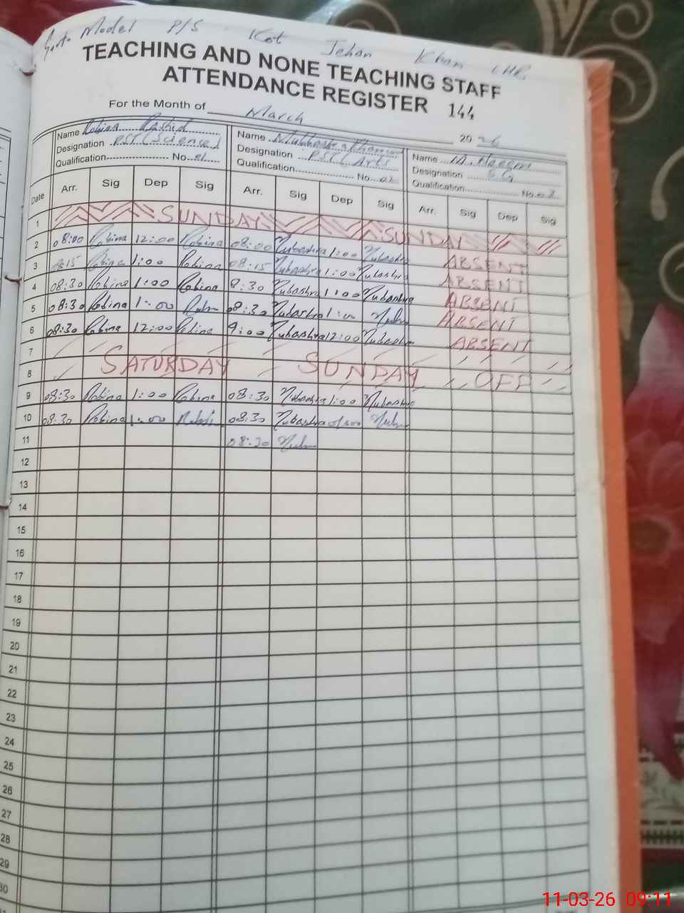 | Remarks (Use Separate Page if Required): Last visit AEO on 27 February 2026 Muhammad Naeem SG absent wef 24 January 2026 to till date Razor wire missing on boundary wall | |||||