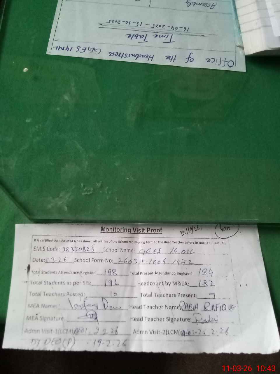 | Certified that this School was Inspected by the Undersigned MEA/DMO Today and the Information Stated Above is as Per Record. | |||||