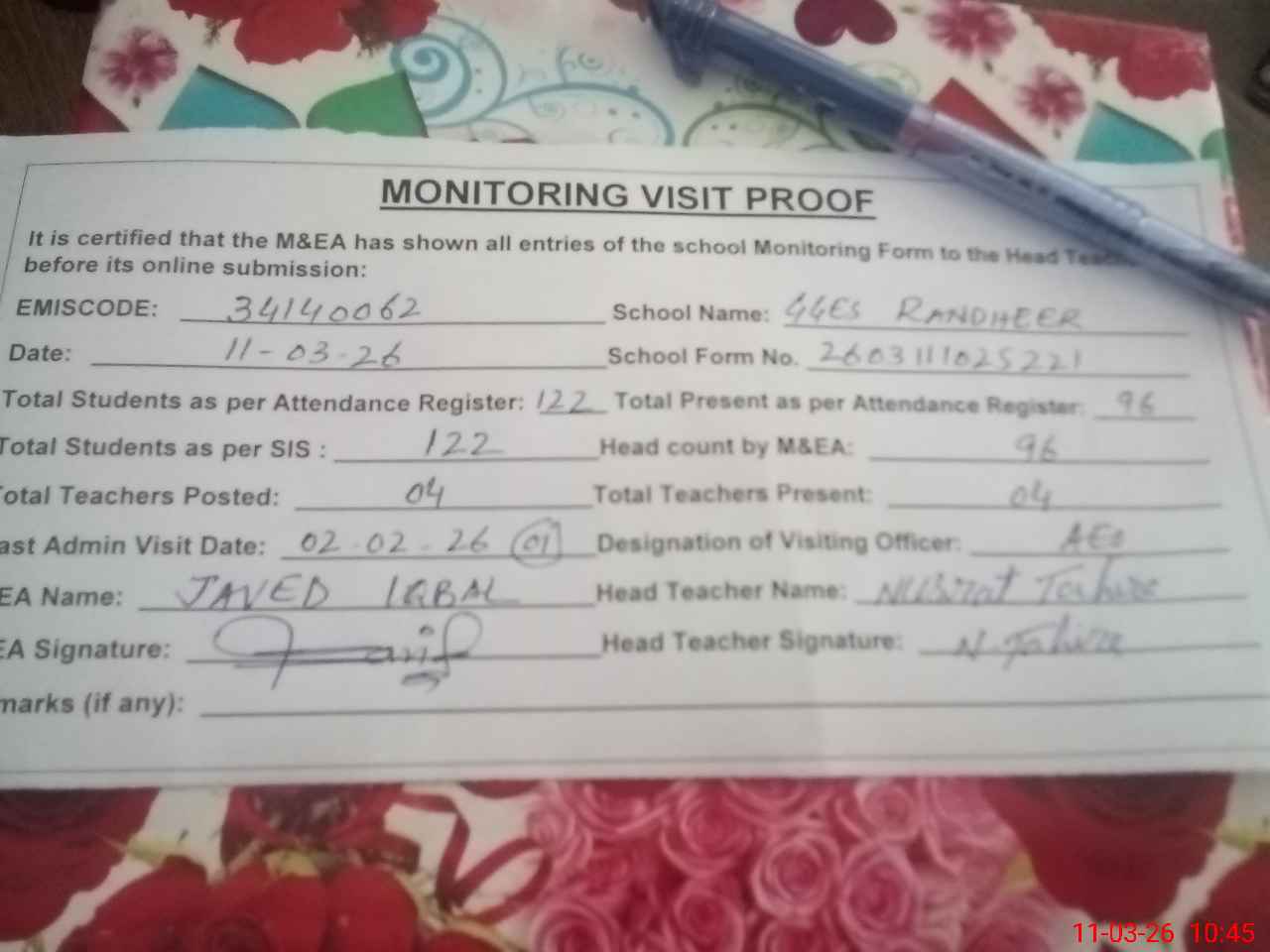 | Attendance Register | Head Teacher | MEA with School | Visit Proof |