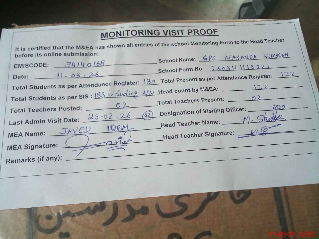 | Attendance Register | Head Teacher | MEA with School | Visit Proof |
