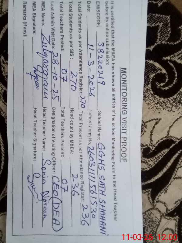 | EMIS Code: 38220219 | Name of School: GGHS SATH SHAHANI | |||