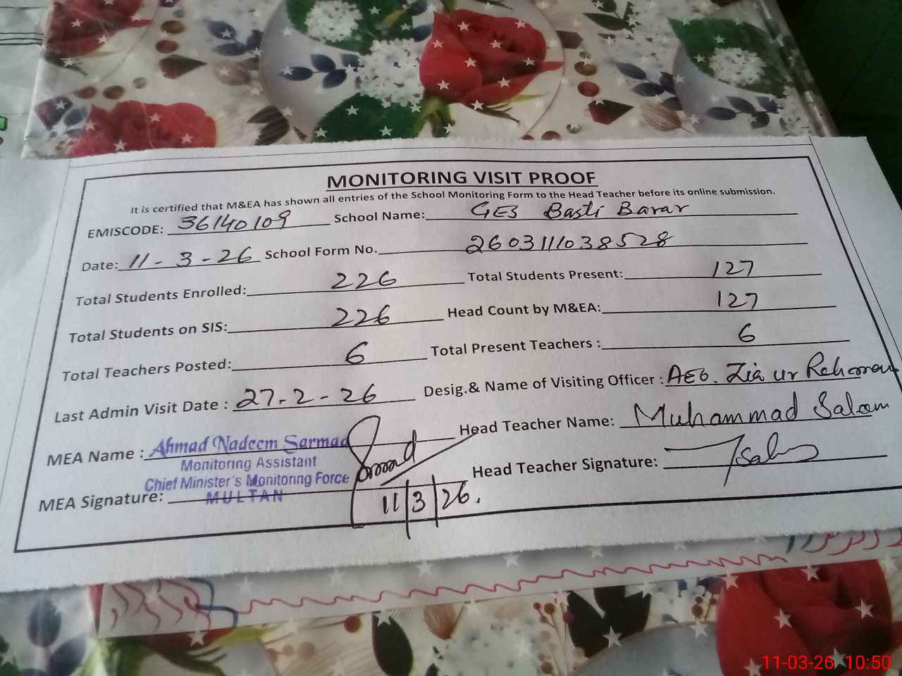 | Attendance Register | Head Teacher | MEA with School | Visit Proof |