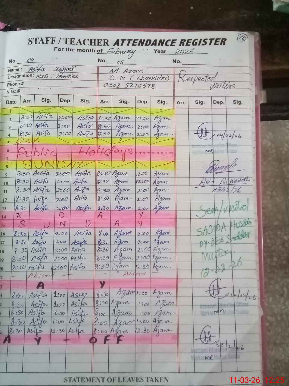 | Name: Sa**** mu**** Designation: (School Headmaster's/Headmistress's) HEADMISTRESS Phone/Cell Number: 03**** |