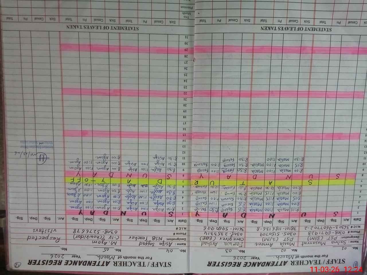 | CNIC | Full Name | Designation | R/C | Absence During Last Calender Month |