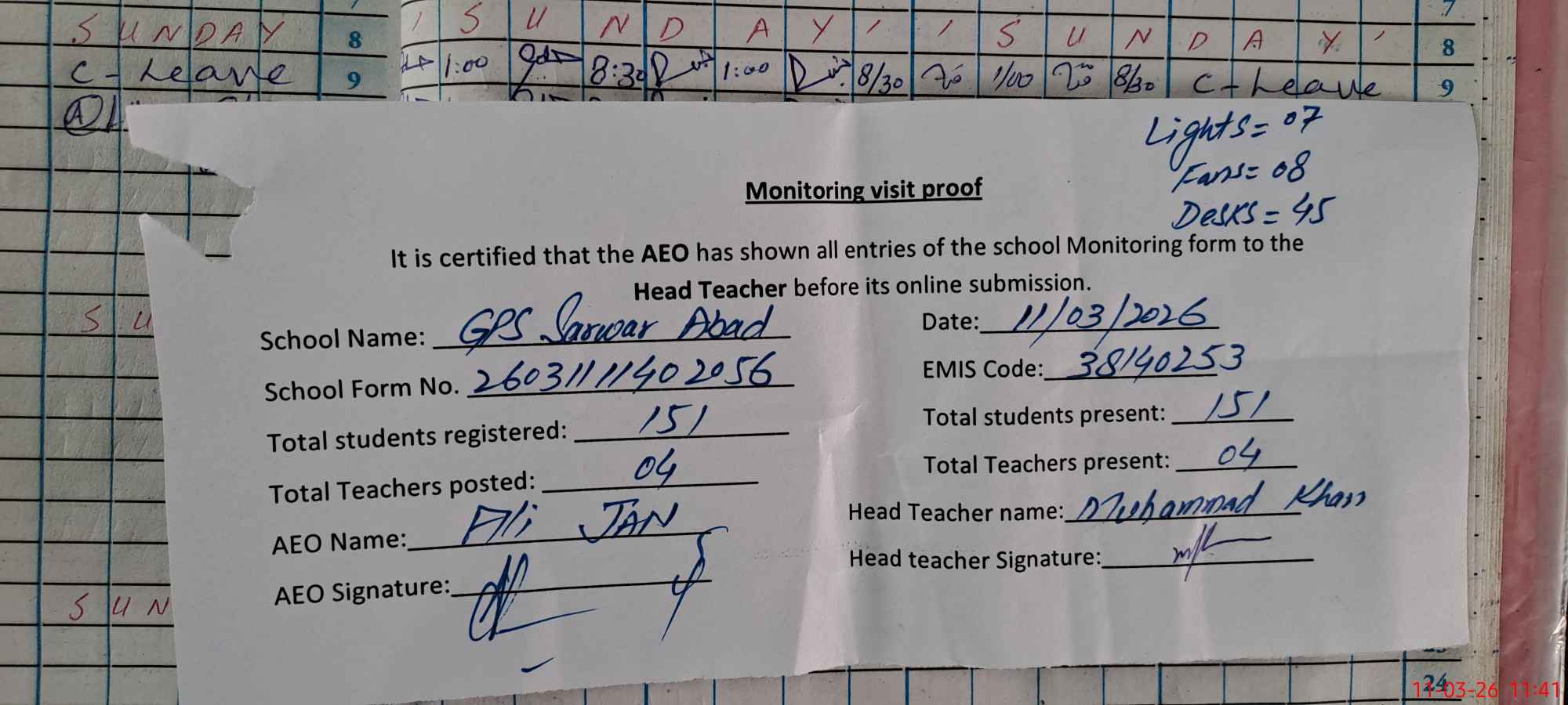| Attendance Register | Head Teacher | MEA with School | Visit Proof |