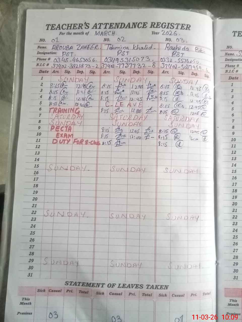 | 37**** | Ar**** Za**** | PST Science/Maths | Regular | 0 | 0 | 0 | 0 | 0 | 0 | 0 | 0 | 0 | Exam Duty |