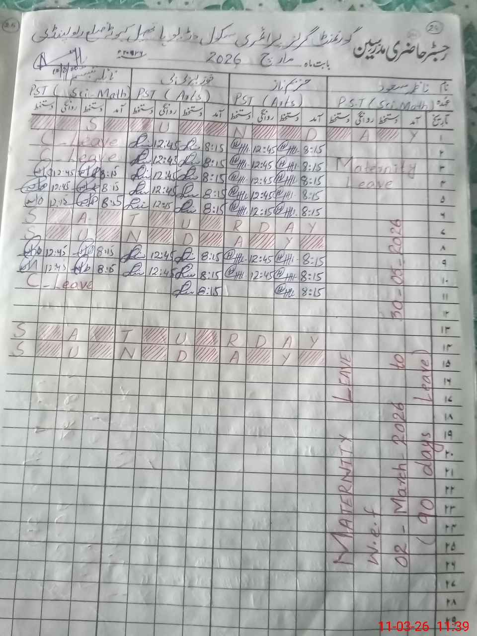 | 37**** | Na**** Ma**** | PST Science/Maths | Regular | 0 | 0 | 0 | 0 | 0 | 0 | 0 | 0 | 0 | Maternity |