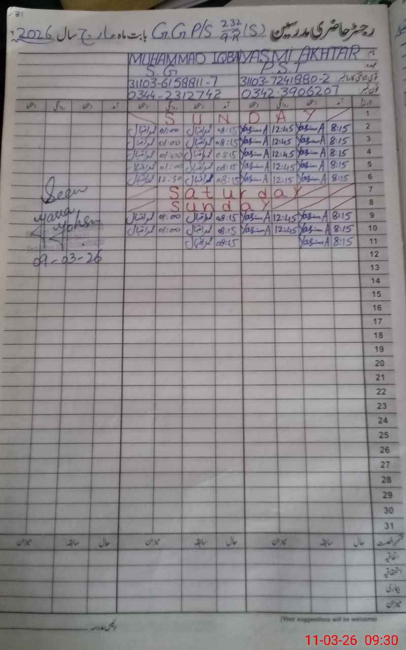 | Monitoring Date: 11-03-2026 | Start Time: 11-03-2026 09:01 AM | End Time: 11-03-2026 09:31 AM | Name of MEA: Mu**** ha**** ul**** BN25 | |