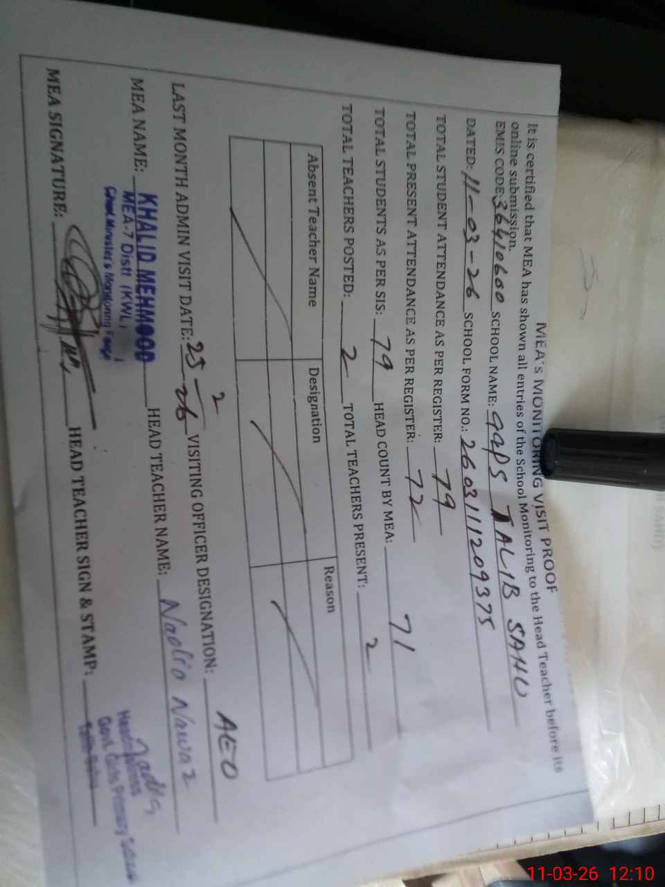 | Attendance Register | Head Teacher | MEA with School | Visit Proof |