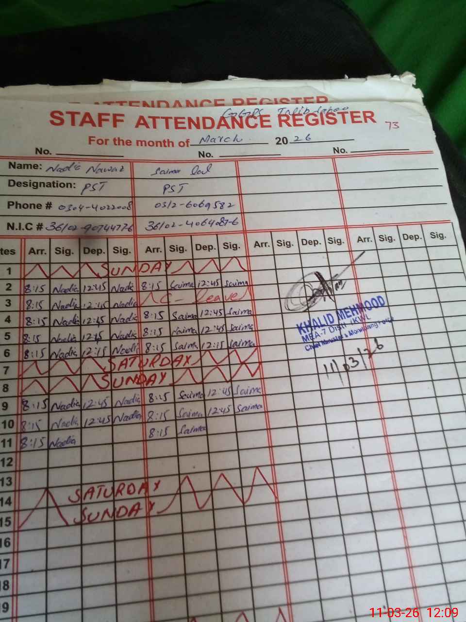 | CNIC | Full Name | Designation | R/C | Absence During Last Calender Month |